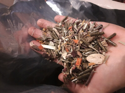 Džiovinta žolė, kviečių sėlenos, žirnių dribsniai, džiovintos: morkos, petražolės, burokėliai, medetkos, dribsniai, mėtų stiebai, džiovinti žiediniai kopūstai, žaliosios pupelės, sėmenų sėklos, avižų žolė, dobilai, saulėgrąžų sėklos, spirulina, inulinas, jukos ekstraktas, mineralai.