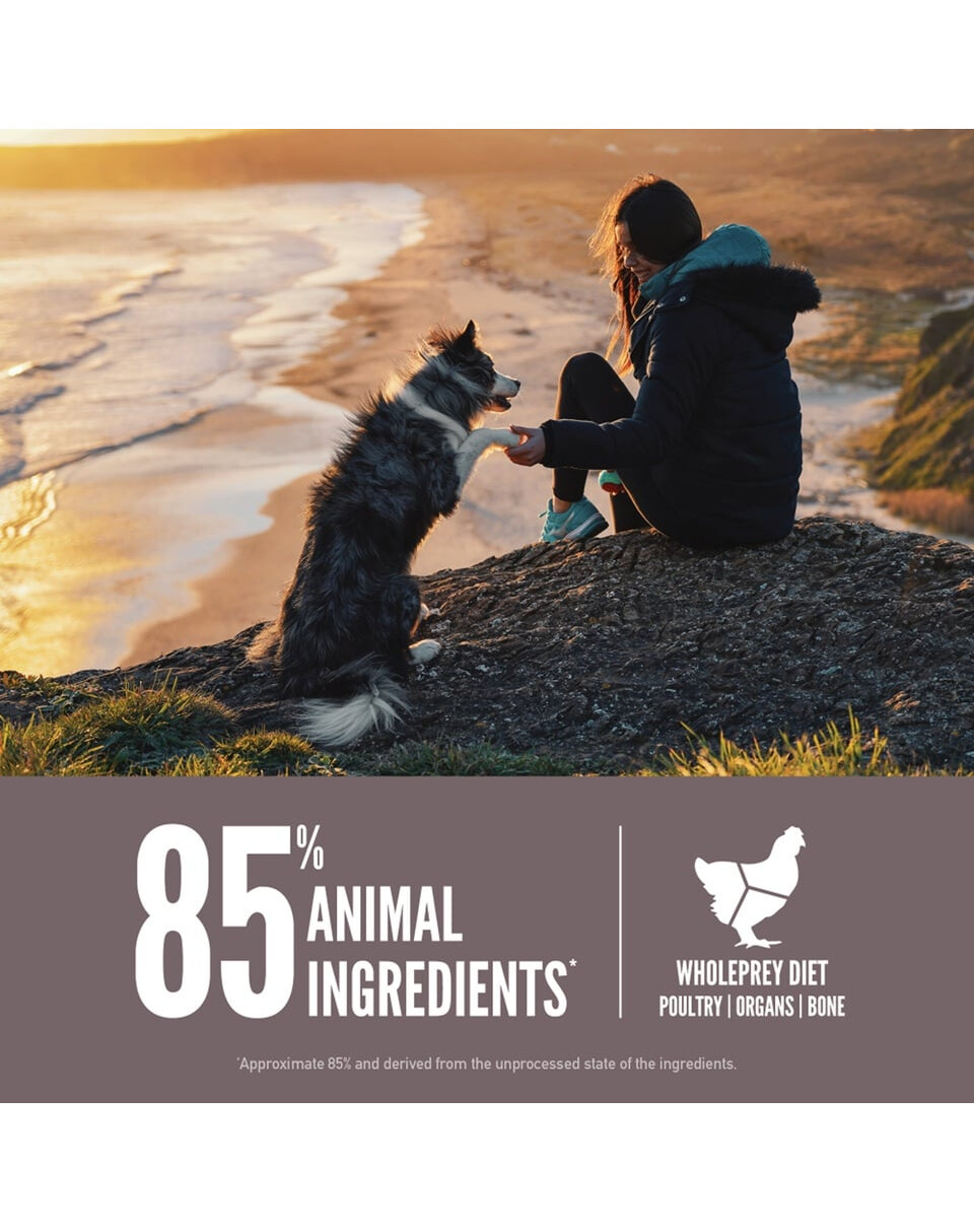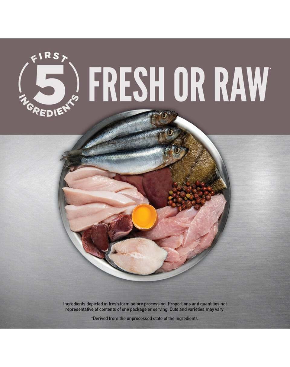 Šviežia vištiena (14 %), švieži sveiki kiaušiniai (6 %), šviežia silkė (6 %), šviežia kalakutiena (6 %), šviežios vištienos kepenys (6 %), šviežia plekšnė (4 %), šviežia skumbrė (4 %), šviežia skumbrė (4 %), šviežia jūros lydekos (4 %), šviežios kalakutienos kepenys (4 %), šviežia vištienos širdis (4 %), vištiena (dehidratuota, 4 %), kalakutiena (dehidratuota, 4 %), neperdirbta skumbrė (dehidratuota, 4 %), neperdirbtos sardinės (dehidratuotos, 4 %), neperdirbta silkė (dehidratuota, 4 %), plekšnė (dehidratuota, 4 %), plekšnė (dehidratuota, 4 %), lęšių skaidulos, neperdirbti raudonieji lęšiai, neperdirbti žalieji lęšiai, neperdirbti žalieji ožragiai, neperdirbti avinžirniai, neperdirbti geltonieji žirniai, neperdirbtos pinto pupelės, neperdirbtos baltosios pupelės, vištienos grūdeliai (dehidratuoti, 1 %), šviežia kalakutienos širdis (1 %), obuolių skaidulos, džiovinti dumbliai (DHA ir EPA šaltinis), moliūgas (dehidratuotas), muskusinis moliūgas (dehidratuotas), morkos (dehidratuotos), vištienos kepenys (liofilizuotos), kalakutienos kepenys (liofilizuotos), šviežias visas moliūgas, šviežias visas muskusinis moliūgas, šviežia visa cukinija, šviežias visas pastarnokas, šviežios morkos, švieži sveiki raudonieji obuoliai, šviežios sveikos bartlett kriaušės, švieži lapiniai kopūstai, švieži špinatai, švieži burokėlių lapai, švieži ropių lapai, rudosios dumblės, sveikos spanguolės, sveikos mėlynės, sveikos Saskatoon uogos, cikorijų šaknys, ciberžolė, pieninis erškėtis, varnalėšų šaknys, levandų žiedai, valerijonų šaknys, erškėtuogės.