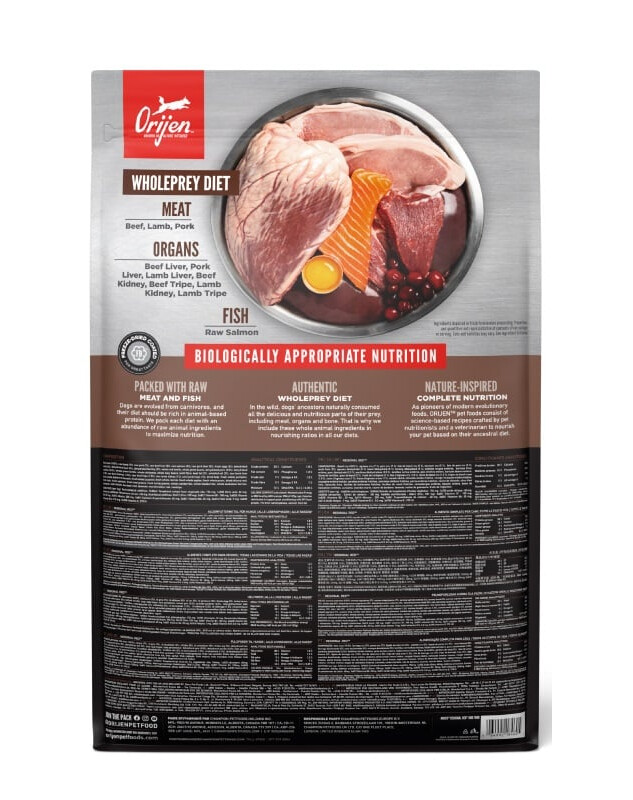 Šviežia angusų jautiena (11 %), šviežia šernų mėsa (4 %), šviežia bizono mėsa (4 %), šviežia arba žalia Romney ėriena (4 %), šviežia Jorkšyro kiauliena (4 %), šviežios jautienos kepenys (4 %), šviežios jautienos skilviai (4 %), šviežios sveikos sardinės (4 %), švieži sveiki kiaušiniai (4 %), šviežios šernų kepenys (4 %), ėriena (dehidratuota, 4 %), jautiena (dehidratuota, 4 %), visa silkė (dehidratuota, 4 %), aviena (dehidratuota, 4 %), kiauliena (dehidratuota, 4 %), šviežios ėrienos kepenys (3,5 %), švieži ėrienos skrandžiai (3,5 %), visos sardinės (dehidratuotos, 3 %), šviežios kiaulienos kepenys (3%), neskaldyti raudonieji lęšiai, neskaldyti žalieji lęšiai, avinžirniai, neskaldyti žalieji žirniai, lęšių skaidulos, neskaldyti avinžirniai, neskaldyti geltonieji žirniai, neskaldytos pinto pupelės, jautienos riebalai (1%), kiaulienos riebalai (1%), silkės aliejus (1%), jautienos griaučiai (dehidratuoti, 1%)žirnių skaidulos, batatai, liucernos, moliūgai, muskusiniai moliūgai, špinatai, morkos, obuoliai, kriaušės, spanguolės, mėlynės, ekologiški jūros dumbliai, saldymedžio šaknis, vaistinė angis, vaistinė ožragė, medetkų žiedai, pankoliai, pipirmėčių lapai, ramunėlės, kiaulpienės, pikantiškieji česnakai, rozmarinai vitaminai ir mineralai