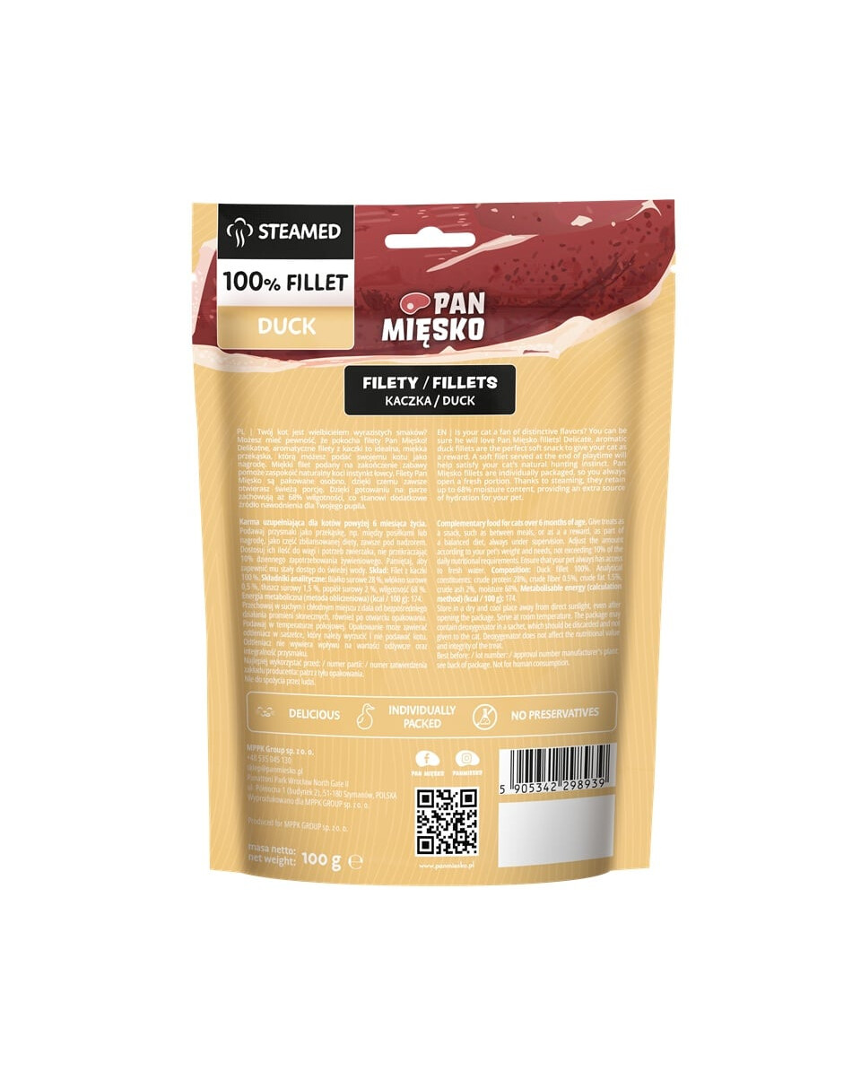 Ar jūsų katė mėgsta ryškius skonius? Galite būti tikri, kad ji įsimylės PAN MIĘSKO filė! Švelnios, aromatingos kacienos filė yra ideali, minkšta užkanda, kurią galite pasiūlyti savo katei kaip apdovanojimą. Minkšta filė, pateikta žaidimo pabaigoje, padės patenkinti natūralų katės medžiotojo instinktą. PAN MIĘSKO filė yra pakuojamos atskirai, todėl visada atidarote šviežią porciją. Garuose virti filė išlaiko net 68% drėgmės, kas yra papildomas drėkinimo šaltinis jūsų augintiniui.