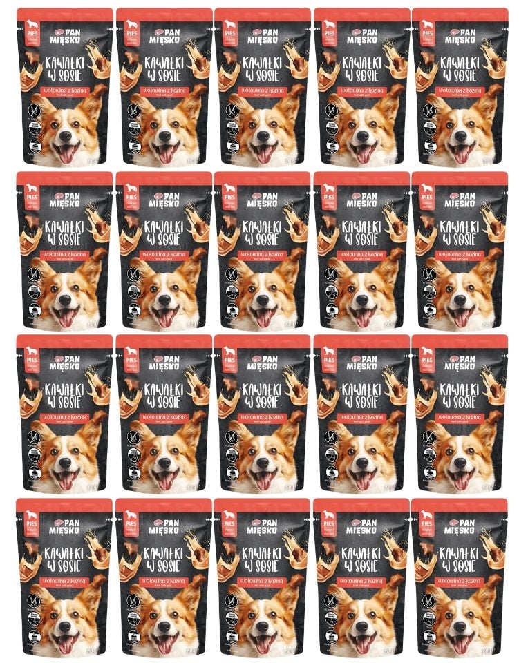 Sultingi gabalėliai, panardinti į aromatingą padažą, patenkins net išrankiausius gurmanus! Tai tinkamai subalansuotas ir mėsos turtingas patiekalas, kuris bus ne tik skanus kasdienis maistas, bet ir ypatingas priedas ar topperis maistui! Receptas papildytas lašišų aliejumi ir džiovintomis alaus mielėmis, kad jūsų šuns kailis būtų gražus ir blizgus, inulinu virškinimui palaikyti, taip pat sveikais žolelėmis.