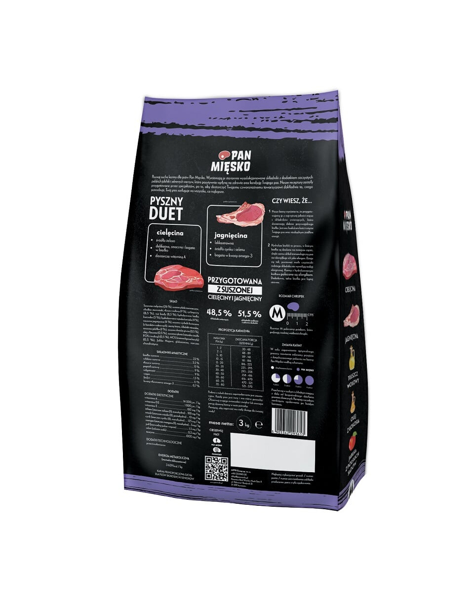 Ponas Mėsinis veršelis su ėriena - tai receptūra, parengta atsižvelgiant į specialius vyresnių šunų ir senjorų poreikius. Joje yra amžių atitinkantis maistingų baltymų kiekis. Sumažintas riebalų kiekis teigiamai veikia brandaus organizmo kepenų ir kasos veiklą. Pridėtos omega - 3 rūgštys, gliukozaminas ir chondroitino sulfatas padeda palaikyti sveikus sąnarius, o pridėtas taurinas padeda palaikyti širdies veiklą. Šioje formulėje maistingus žirnius pakeitėme lengvai virškinamais batatais ir bulvėmis, todėl, palaikomas Yucca Mojave ekstrakto ir pridėjus MOS ir FOS prebiotikų, maistas yra lengvai virškinamas ir teigiamai veikia virškinimo ir virškinimo sistemas.