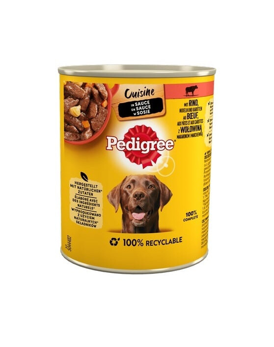 "PEDIGREE Cuisine" su jautiena, makaronais ir morkomis padaže yra suaugusių šunų poreikius atitinkantis ėdalas. Šioje skonių kompozicijoje jūsų augintinis atras švelnius mėsos gabalėlius su gardžiais makaronais ir morkomis aromatingame padaže su Provanso žolelėmis. Šis visavertis maistas yra vitaminų D3 ir E bei cinko šaltinis, kuris palaiko jūsų šuns odos sveikatą ir gražų kailį. PEDIGREE Adult Cuisine su jautiena, makaronais ir morkomis padaže yra natūralių maistinių skaidulų optimaliam virškinimui. Šerdami savo šunį PEDIGREE ėdalu, būsite tikri, kad išlaikysite sveiką energiją ir gerą savijautą. Jo sudėtį sukūrė WALTHAMTM Gyvulininkystės instituto mitybos specialistai ir veterinarijos gydytojai. Pakuotę galima 100 % perdirbti.