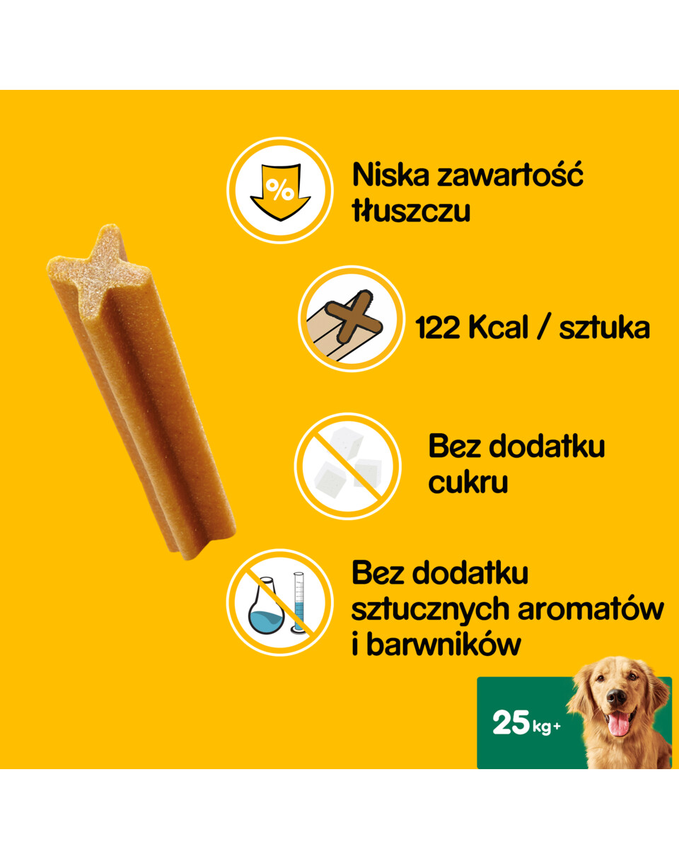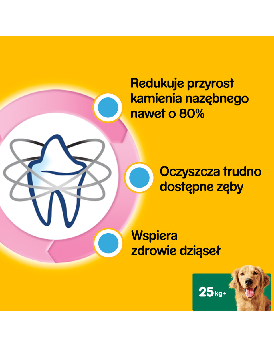 PEDIGREE DentaStix Daily Oral Care - tai skanėstai, mažinantys dantų akmenų susidarymą šunims. Jų unikali forma padeda išvalyti net sunkiai pasiekiamus tarpdančius. Speciali formulė, pagal kurią sukurtas PEDIGREE® DentaStix, ne tik pašalina jūsų šuns dantų akmenis, bet ir stiprina dantenas. Šio dydžio skanėstas tinka didesniems nei 25 kg sveriantiems ir vyresniems nei 4 mėnesių šunims.