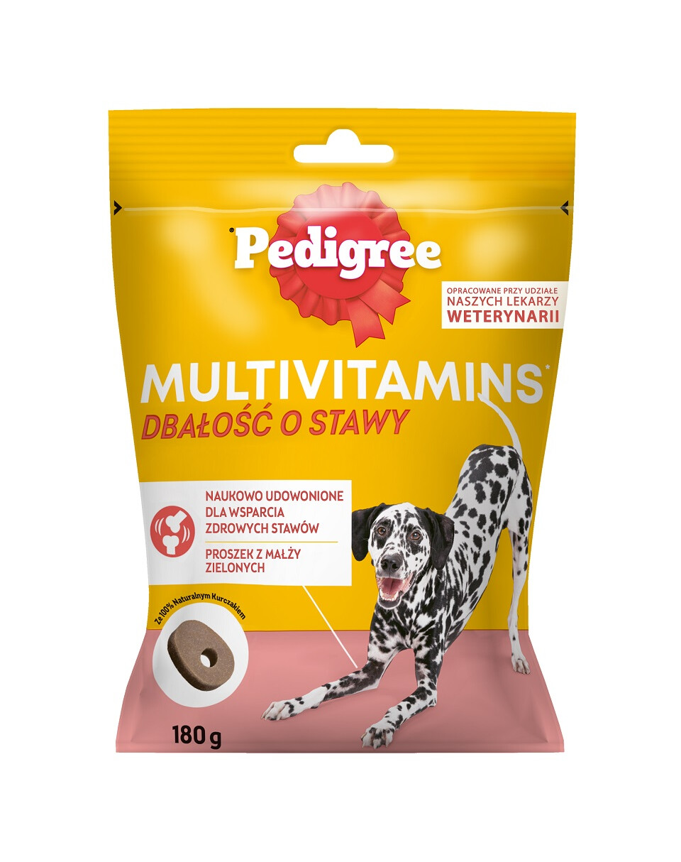 PEDIGREE Multivitamins Joint Care yra vištienos skonio papildomas pašaras suaugusiems šunims, kurio sudėtyje esantys moksliškai įrodyti žaliųjų midijų milteliai palaiko sveikus sąnarius. Sudėtį sukūrė WALTHAM Gyvulininkystės instituto veterinarijos gydytojai ir mitybos specialistai. Su "PEDIGREE Multivitamins Joint Care" efektyviai pasirūpinsite savo šuns sveikata ir gyvybingumu. Kiekvienoje porcijoje yra specialiai pritaikytas multivitaminų ir gliukozamino mišinys. Šis papildomas ėdalas sukurtas iš aukščiausios kokybės ingredientų, nenaudojant dirbtinių dažiklių ir kvapiųjų medžiagų. Pakuotėje yra maždaug 30 vienetų.