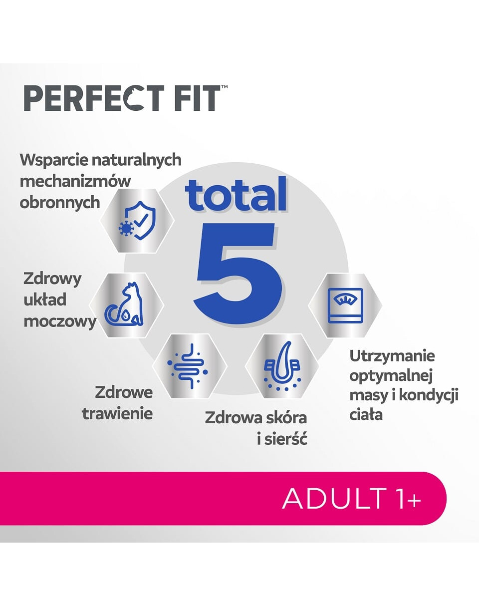 Skanus maistas Perfect Fit Adult 1+ turintis šviežio lašišos turi unikalią Total 5 formulę, kuri palaiko 5 svarbiausias suaugusių augintinių sveikatos sritis: stiprina imuninę sistemą, sveiką virškinimą, sveiką šlapimo sistemą, sveiką odą ir kailį bei palaiko optimalų kūno svorį ir būklę. Perfect Fit Adult 1+ receptūra buvo sukurta bendradarbiaujant su veterinarijos gydytojais ir mitybos specialistais iš WALTHAM Gyvūnų Mokslų Instituto, kad suaugusiems katėms būtų suteikti būtini maistingieji komponentai. Kaip ir kiti variantai, maistas Perfect Fit Adult 1+ turintis šviežio lašišos suteikia papildomų privalumų: palaiko gyvybingumą ir judrumą, stiprius raumenis, sveikas dantenas ir dantis, taip pat turi natūralių prebiotikų, kad rūpintųsi žarnyno mikrobiomu. Pasirinkdami šį maistą savo augintiniui, galite būti tikri, kad unikali Perfect Fit formulė palaiko viso jūsų katės organizmo sveikatą ir suteikia papildomų sveikatos privalumų, kurie yra specialiai pritaikyti jos amžiui ir individualiems poreikiams.