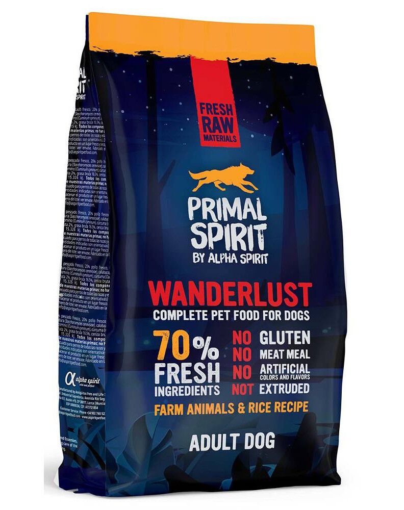 "Primal Spirit Wanderlust" - tai pusiau minkštas visavertis ėdalas suaugusiems šunims be glitimo, su ryžiais ir vištiena.
