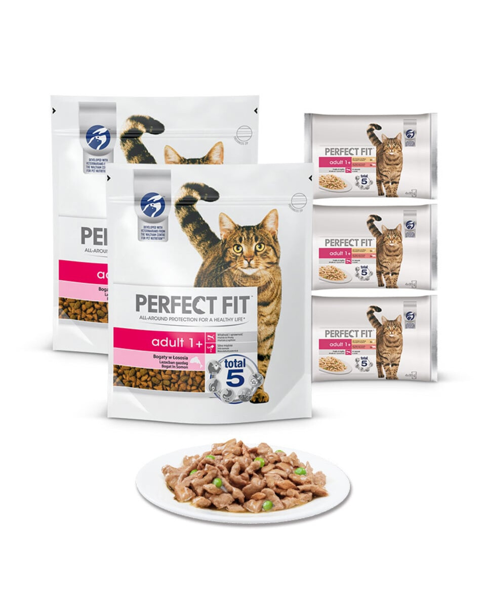 PERFECT FIT (Adult 1+) 2 x 750g maistas turtingas lašišu - sausas maistas suaugusioms katėms + konservai 12x85g - šlapias maistas katėms padaže (su vištiena ir žirneliais, su jautiena ir morkomis)