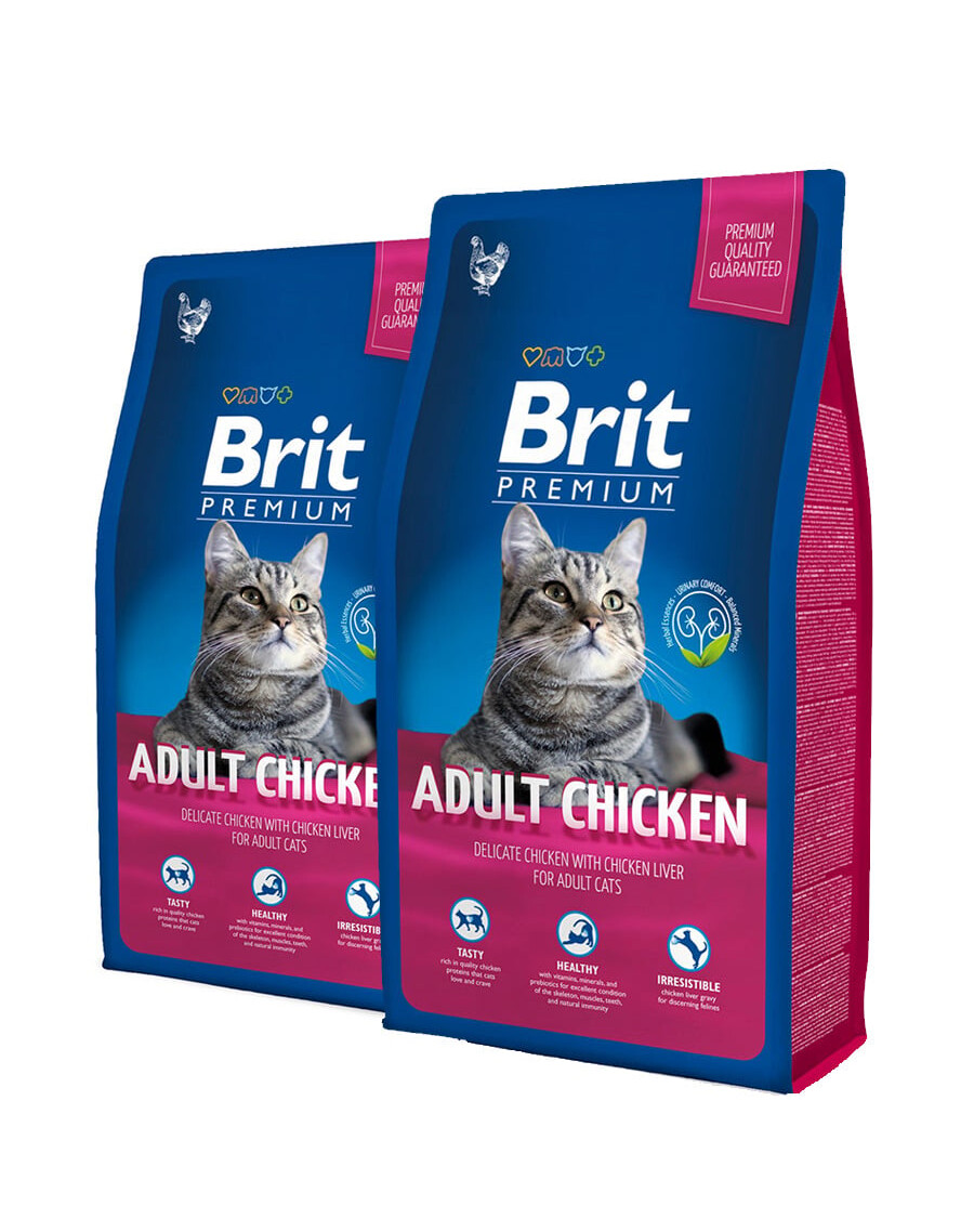 BRIT Premium Cat Adult Chicken sudėtis: vištiena 40 % (džiovinta vištiena 20 %, vištienos miltai 20 %), ryžiai, vištienos riebalai (konservuoti tokoferoliais), kukurūzai, alaus mielės, hidrolizuotos vištų kepenėlės 4 %, lašišų aliejus 1 %, džiovintas burokėlių minkštimas, džiovintos kiaulpienės 0,25 %, prebiotikai (manano-oligosacharidai 140 mg/kg, frukto-oligosacharidai 110 mg/kg), jukos šidigeros ekstraktas (75 mg/kg), vaisių ir žolelių ekstraktas (rozmarinas, gvazdikėliai, citrusiniai, ciberžolė, 55 mg/kg).