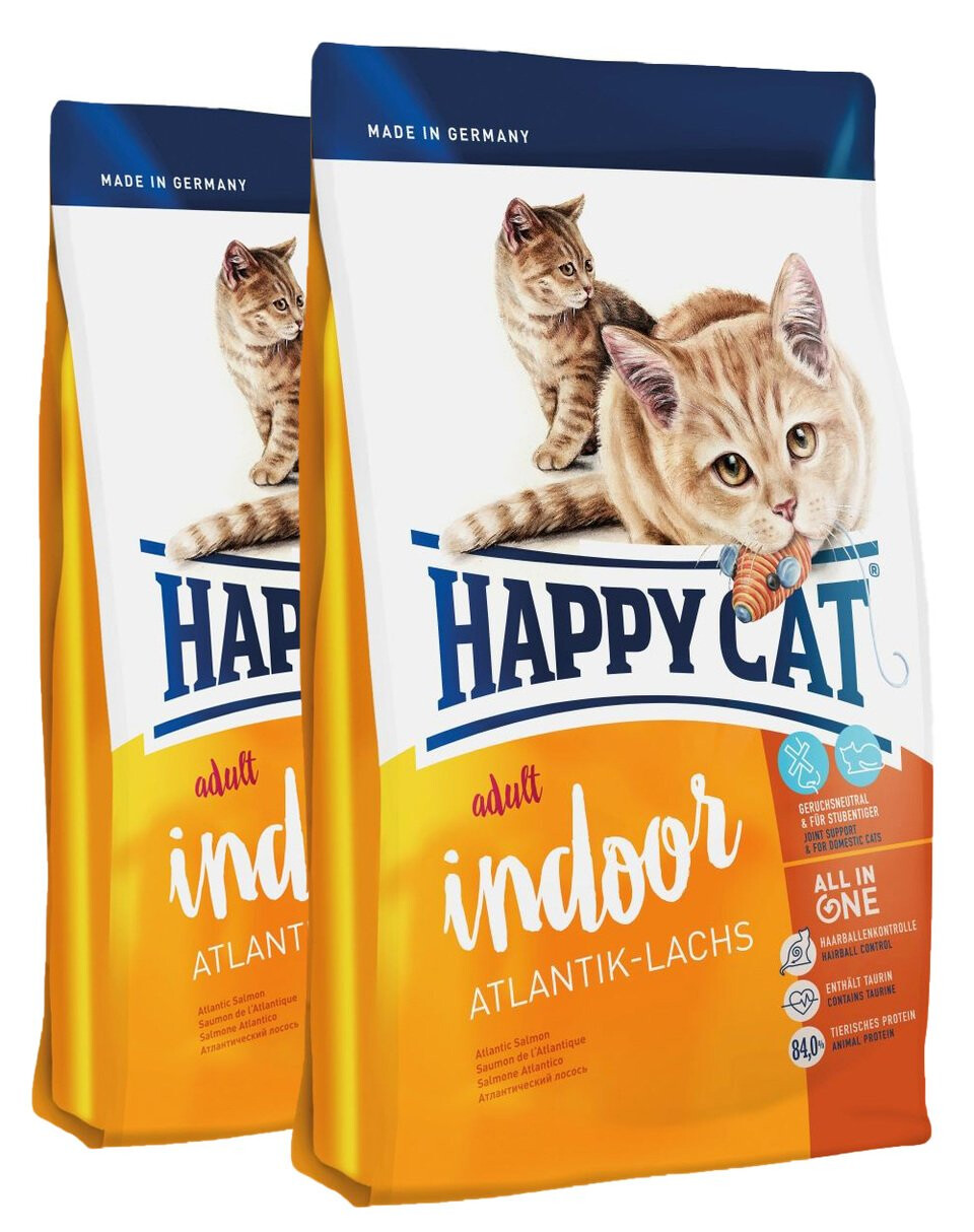 "Happy Cat Indoor Atlantik-Lachs" sausas ėdalas suaugusioms katėms su Atlanto lašiša ir paukštiena specialiai sukurtas katėms, kurios neišeina iš namų. Yucca schidigera ekstraktas sumažina nemalonų katės kraiko kvapą.