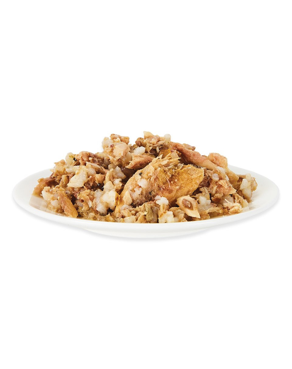 Skumbrė 70 %, sardinė 5 %, žuvies sultinys 24 %, ryžiai 1 %. Be priedų