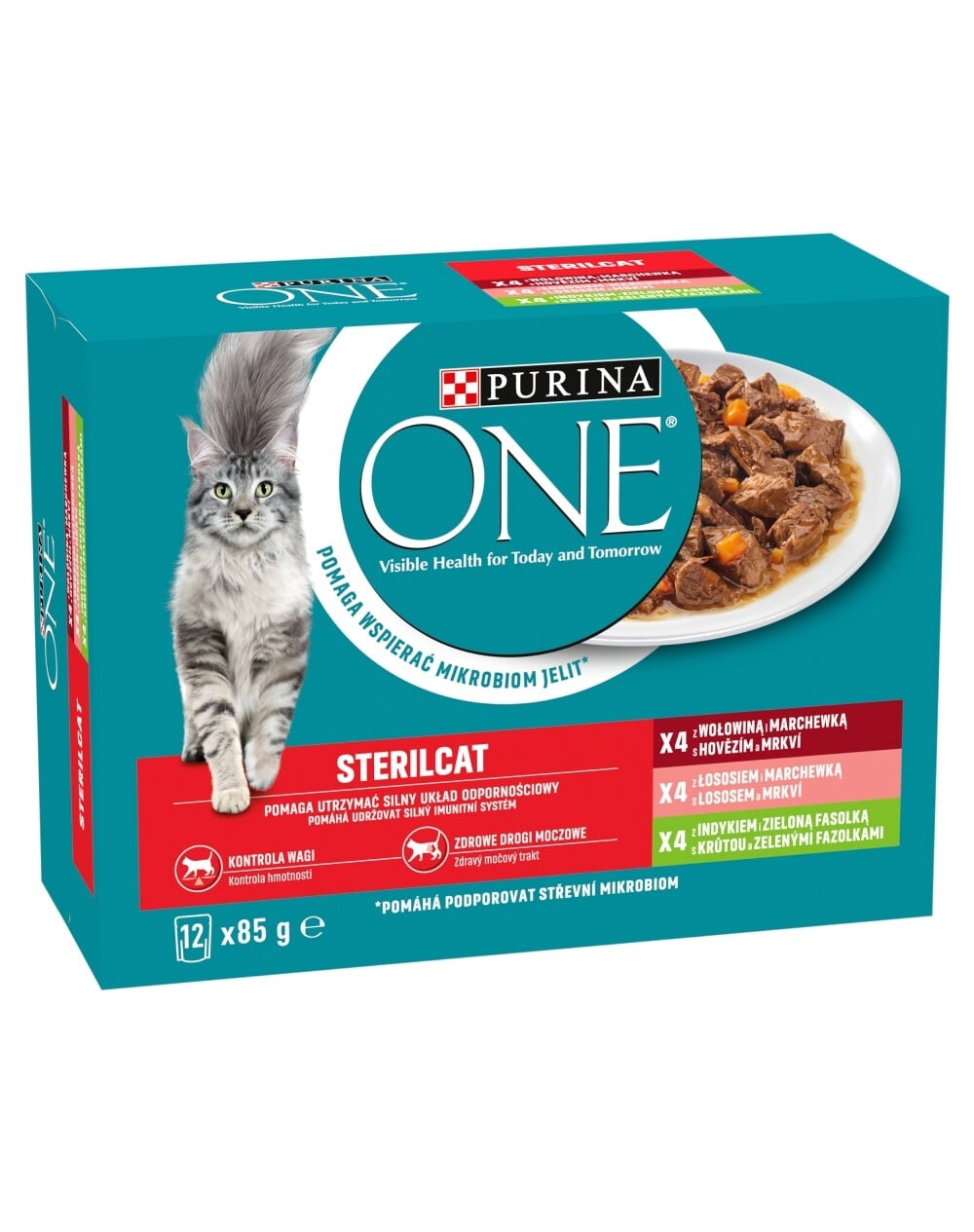PURINA ONE Sterilcat yra visiškai subalansuotas drėgnas maistas suaugusioms katėms po sterilizacijos, siūlomas variantuose su jautiena ir morkomis, su lašiša ir morkomis bei su kalakutiena ir žaliaisiais pupelėmis.
