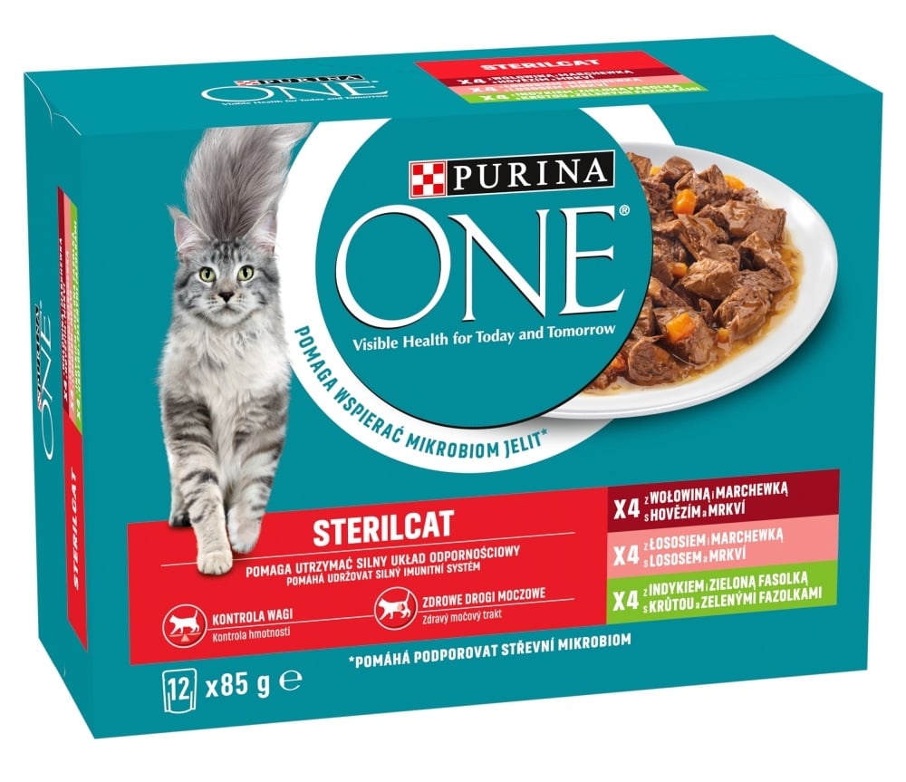 PURINA ONE Sterilcat yra visiškai subalansuotas drėgnas maistas suaugusioms katėms po sterilizacijos, siūlomas variantuose su jautiena ir morkomis, su lašiša ir morkomis bei su kalakutiena ir žaliaisiais pupelėmis.
