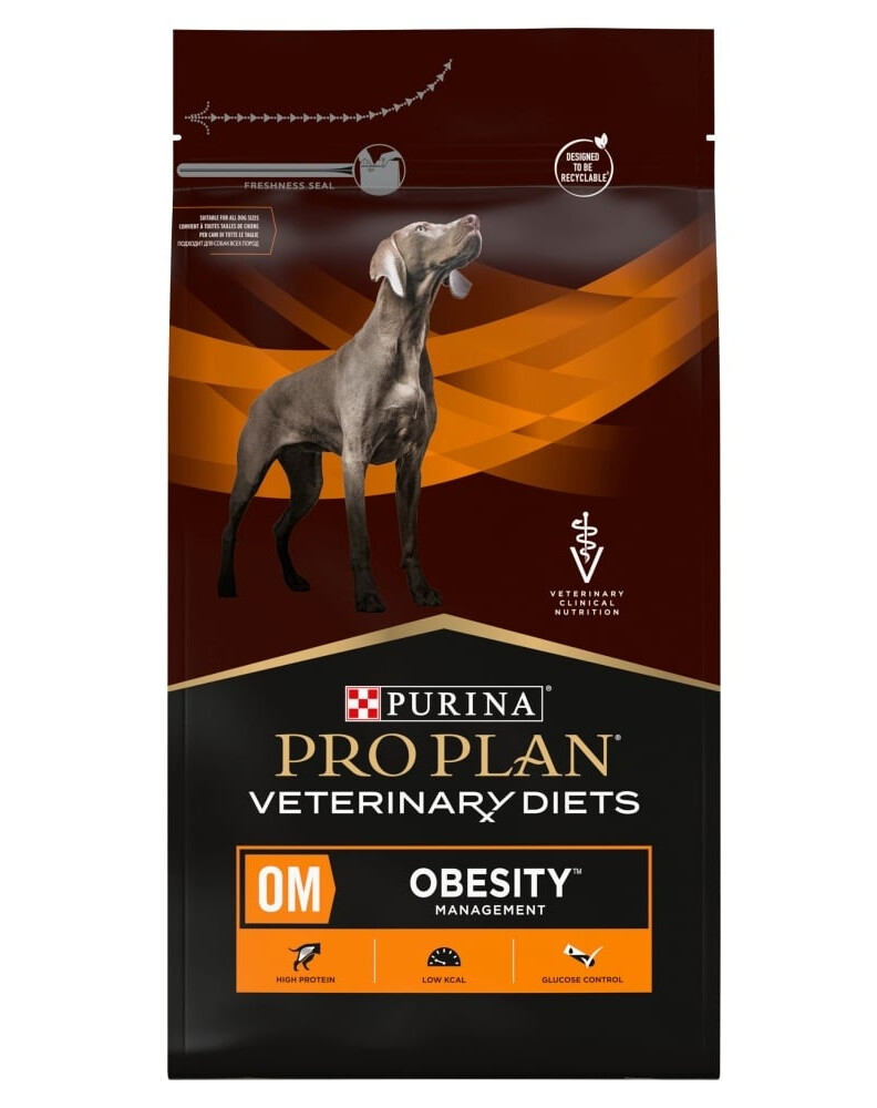 PURINA PRO PLAN Veterinary Diets Canine OM Obesity Management yra specializuota veterinarinė dieta suaugusiems šunims, sukurta siekiant sumažinti per didelį kūno svorį ir stabilizuoti gliukozės lygį gyvūnams, sergantiems diabetu. Maistas turi sumažintą energinę vertę ir žemą lengvai virškinamų cukrų kiekį, kas padeda kontroliuojamai riebalų netekimui, išlaikant raumenų masę.