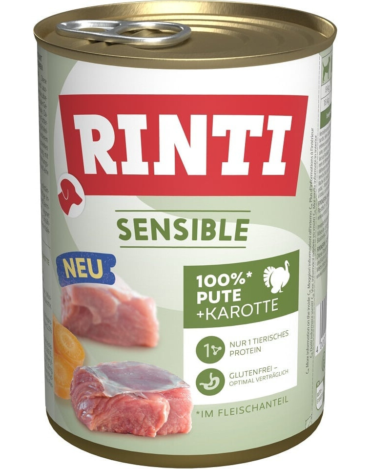 "RINTI Sensible" yra aukštos kokybės visavertis ėdalas, pagamintas tik iš kalakutienos ir morkų. Jo sudėtyje nėra kitos mėsos, grūdų ar angliavandenių. Tai gali sumažinti maisto alergijų ir netoleravimo riziką, kuri, be kita ko, gali paveikti odą ir kailį. Praturtinimas morkomis pagerina maisto įsisavinimą, o angliavandeniai yra mažai riebalų turintis energijos šaltinis. Rinti Sensible maistas taip pat tinka šerti glitimo netoleruojančius šunis, nes jo sudėtyje nėra glitimo, kuris gali sukelti skrandžio ir žarnyno problemų.