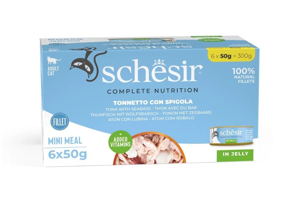 Rinkinys 6 porcijų Schesir maisto, kuriame natūralūs tuno ir jūros ešerio filė buvo garinami ir uždaryti minkštoje, skanioje želė. Maistas remiasi paprastais, natūraliais ingredientais, užtikrinančiais katės aukštą baltymų kiekį ir palaikantys tinkamą organizmo hidrataciją. Dirbtinių priedų nebuvimas garantuoja sveiką ir pilnavertį patiekalą jūsų augintiniui.