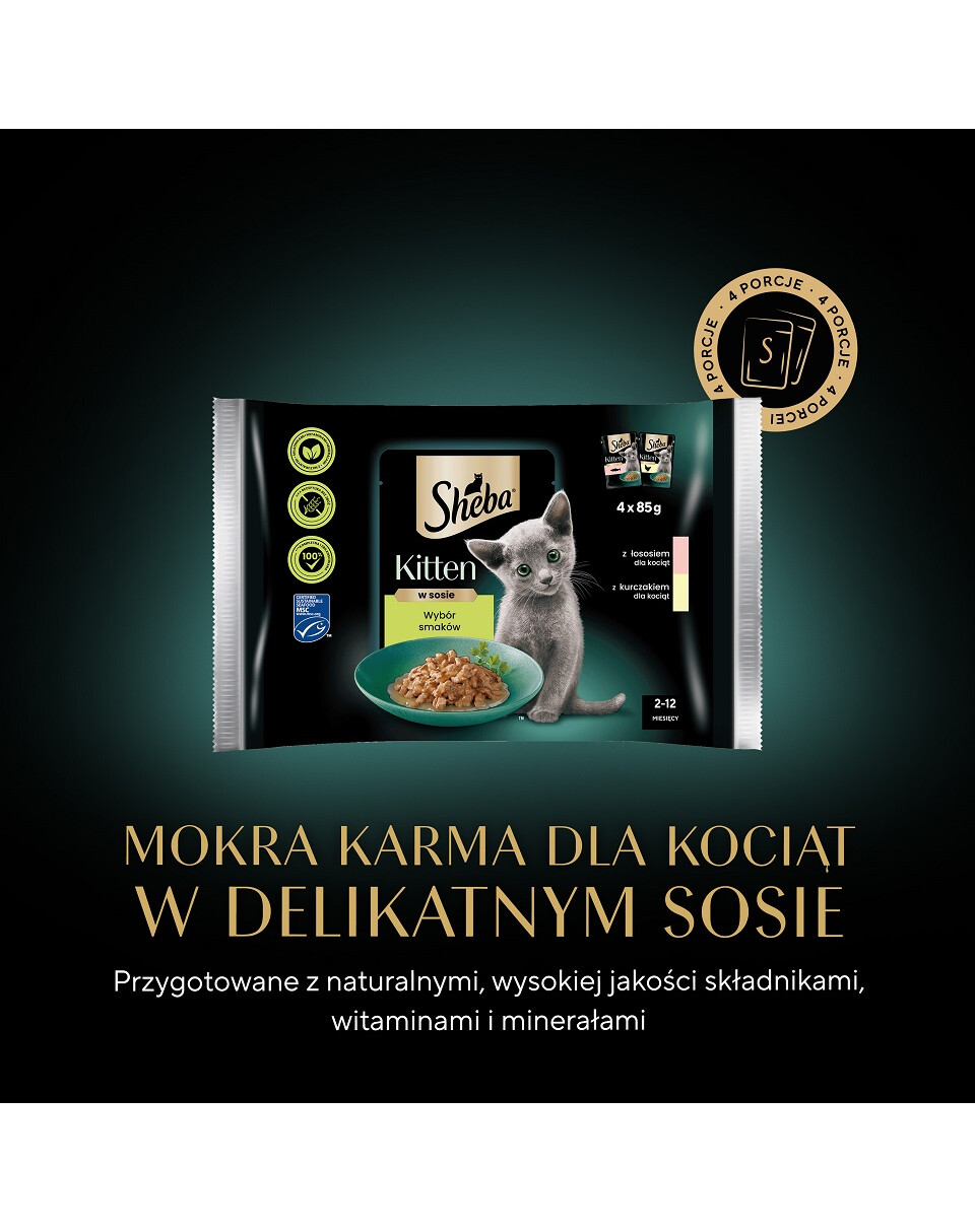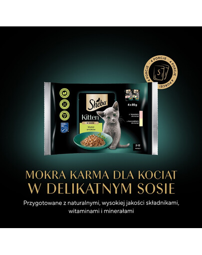 "Sheba Kitten Choice of Flavours " - tai kruopščiai atrinktų švelnių gabalėlių mišinys gardžiame padaže. Paprasti receptai palaiko sveiką augančio draugo augimą. Tai švelnių gabalėlių su lašiša ir vištiena, idealiai tinkančių pieniniams dantims ir puikiai pritaikytų mažoms burnytėms, patiekalų pasiūlymas. Sheba® Kitten Selection of Flavours master receptūros paslaptis - aukštos kokybės natūralūs ingredientai ir vitaminai bei mineralai. Maistas specialiai sukurtas besivystantiems kačiukams, kad palaikytų jų imuninę sistemą, stiprius kaulus ir augančius raumenis. Leiskite savo augančiai katei pasimėgauti kulinariniu malonumu su gardžiu Sheba® Kitten Choice of Flavours, kuris patenkins net ir išrankiausią apetitą.