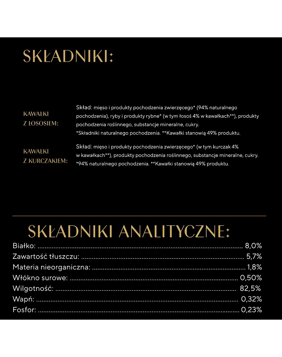 Gabalėliai su lašiša: Sudėtis: mėsa ir gyvūninės kilmės produktai* (94 % natūralios kilmės), žuvis ir žuvies produktai* (įskaitant 4 % lašišos gabalėlių**), augalinės kilmės produktai, mineralai, cukrus. *Natūralios kilmės sudedamosios dalys. **Losies gabaliukai sudaro 49 % produkto.