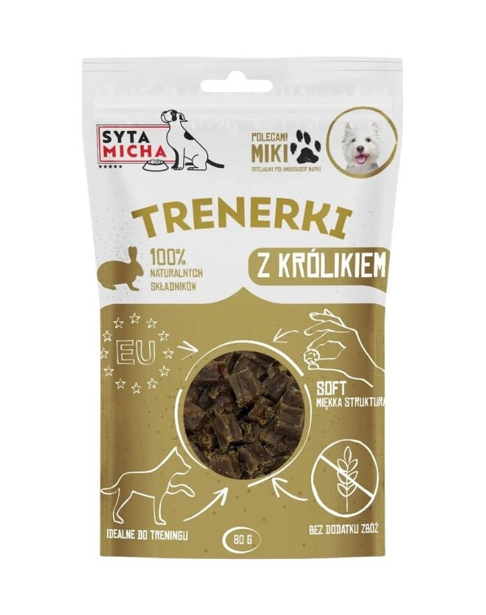 �3CSTRONG�3EAromatiniai, mažai kaloringi treniruočių skanėstai�3C/STRONG�3, sukurti atsižvelgiant į reiklius šunis.�3CSTRONG�3 Treneriai su triušiu iš Syta Micha�3C/STRONG�3 yra maži, minkšti gabalėliai vienam kąsniui, idealiai tinkantys kasdieniam treniravimui ir apdovanojimams.�3CBR�3�3CBR�3�3CSTRONG�3Triušis�3C/STRONG�3 yra vienas lengvai virškinamo baltymo šaltinis ir natūralus vitamino A, B grupės vitaminų, cinko, geležies bei omega-3 ir omega-6 rūgščių šaltinis. Receptūra palaiko sveiką odą ir kailį, imunitetą bei tinkamą nervų sistemos veiklą. Dėl mažo riebalų kiekio skanėstai taip pat tinka antsvorio turintiems šunims.�3CBR�3�3CBR�3�3CSTRONG�3Monobaltyminė formulė�3C/STRONG�3 daro juos tinkamu pasirinkimu šunims su jautria virškinimo sistema ir alergijomis. Sandarus pakuotė su užtrauktuku leidžia išlaikyti šviežumą ir minkštą konsistenciją po atidarymo.�3CBR�3�3CBR�3�3CSTRONG�3Privalumai:�3C/STRONG�3�3CBR�3�3Monobaltyminiai skanėstai su triušiu�3CBR�3Tinkami šuniukams, suaugusiems šunims ir senjorams�3CBR�3Rekomenduojami alergiškiems ir jautriems šunims�3CBR�3Mažas riebalų ir cholesterolio kiekis�3CBR�3Minkšti, maži gabalėliai, idealiai tinkantys treniruotėms�3CBR�3Be glitimo, kukurūzų, kviečių, sojos ir dirbtinių priedų�3CBR�3Patogi pakuotė su užtrauktuku�3CBR�3�3CBR�3�3CSTRONG�3Sudėtis�3C/STRONG�3: 99% triušis, 1% augalinė glicerina�3CBR�3�3CBR�3�3CSTRONG�3Analitinė sudėtis:�3C/STRONG�3�3CBR�3Baltymai 55.70%�3CBR�3Riebalai 16.10%�3CBR�3Drėgmė 9.60%�3CBR�3Bruto pelenai 15.30%�3CBR�3Bruto skaidulos 2.0%�3CBR�3�3CBR�3�3CSTRONG�3Kaloringumas�3C/STRONG�3: 372.9 kcal/100g