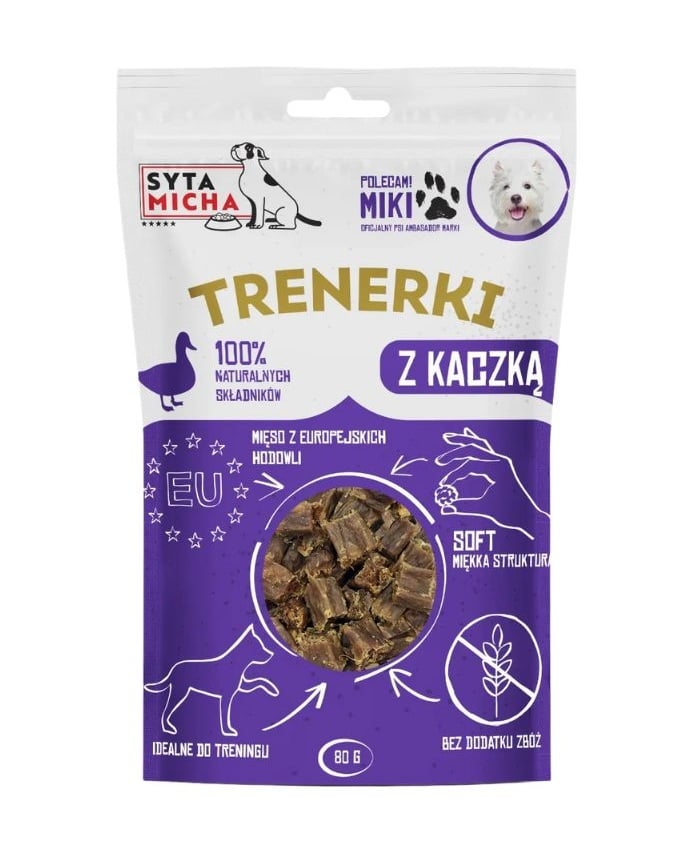 <STRONG>Išskirtinai skanūs, minkšti treniruočių skanėstai šunims bet kuriame gyvenimo etape.<STRONG> Treniravimo skanėstai su antis iš Syta Micha yra maži kąsniai su intensyviu aromatu, puikiai tinkantys kasdieniam treniravimui ir apdovanojimams.<BR><BR><STRONG>Antis<STRONG> yra vienintelis lengvai virškinamo, hipoalerginio baltymo šaltinis, turtingas vitaminais A, C ir E, kurie palaiko imunitetą, taip pat mineralais (kalciu, fosforu, cinku), būtinais stipriems kaulams ir sąnariams. Anties mėsoje esantys viengubi ir daugialypiai nesočiosios riebalų rūgštys palaiko širdies ir kraujagyslių sistemą bei suteikia energijos aktyvumo metu.<BR><BR><STRONG>Monobaltyminė formulė<STRONG> užtikrina, kad skanėstai tinka ir šunims su jautria virškinimo sistema. Sandarus pakuotė su užtrauktuku leidžia išlaikyti šviežumą ir minkštą konsistenciją po atidarymo.<BR><BR><STRONG>Privalumai:<STRONG><BR><BR>monobaltyminiai skanėstai su antis<BR>tinka šuniukams, suaugusiems šunims ir senjorams<BR>rekomenduojama alergiškiems ir jautriems šunims<BR>minkšti, aromatingi kąsniai, puikiai tinkantys treniruotėms<BR>be grūdų, glitimo, cukraus ir dirbtinių priedų<BR>patogi pakuotė su užtrauktuku<BR><BR><STRONG>Sudėtis<STRONG>: 99% antis, 1% augalinė glicerina<BR><BR><STRONG>Analitinė sudėtis:<STRONG><BR>Baltymai 49.20%<BR>Riebalai 28.80%<BR>Drėgmė 8.70%<BR>Žaliavos pelenai 10.70%<BR>Žaliava skaidulos 0.60%<BR><BR><STRONG>Kaloringumas<STRONG>: 464 kcal/100g