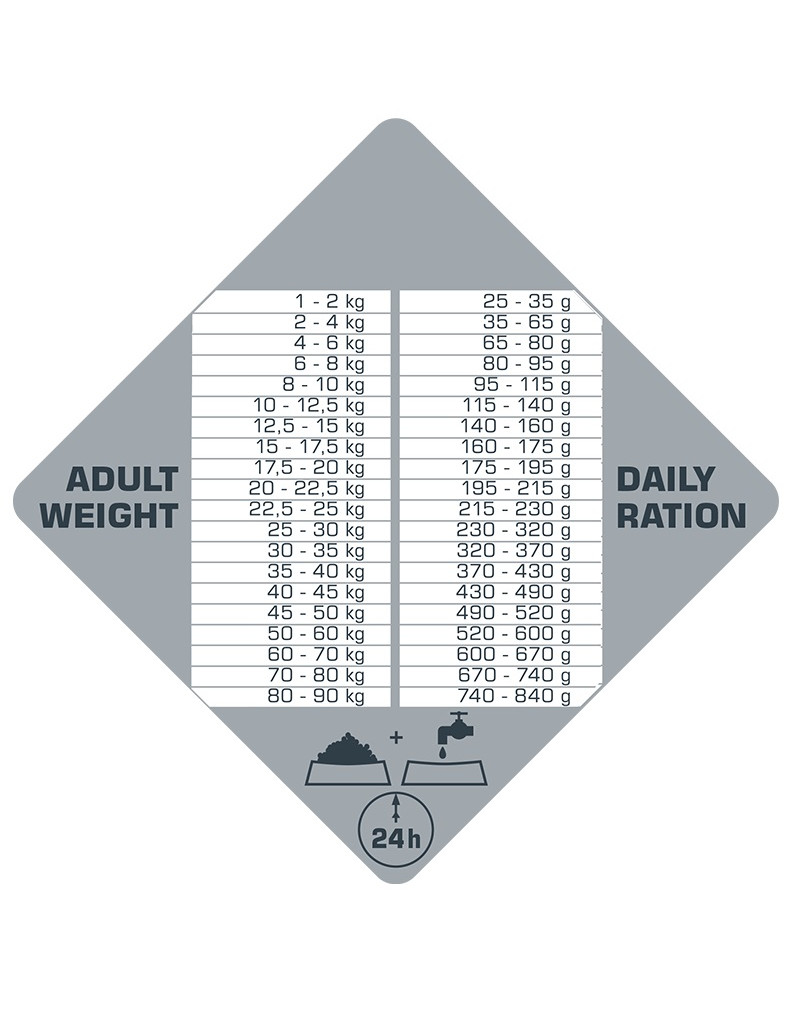 Pasirūpinkite, kad gyvunas visada turėtų pakankamai šviežio vandens prieinamoje vietoje . Šuns dienos maisto norma gali skirtis atsižvelgiant į jo dydį, amžių, aktyvumą ir laikymo sąlygas. Tikslias rekomendacijas rasite ant pakuotės.