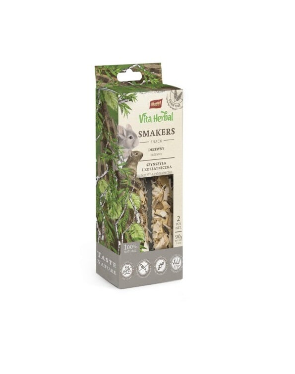 "Vita Herbal Smakers" - tai 100 % grūdų neturintis skanėstas, idealiai tinkantis šinšiloms ir jūrų kiaulytėms. Kaip rodo pavadinimas, "Wood Smakers" sudaro lapuočių medžių žievė ir šakelės. Jis veikia kaip natūralus kramtomasis paviršius, kad būtų tinkamai sukramtyti dantys, o kieta gydymo struktūra dar labiau skatina šį procesą. Be to, šakelės ir žievė yra puikus ląstelienos šaltinis ir teigiamai veikia gyvulių virškinimo sistemą, palengvina viduriavimo ir žarnyno katarų simptomus. "Smakers" sudėtyje nėra pridėtinio cukraus ar medaus.