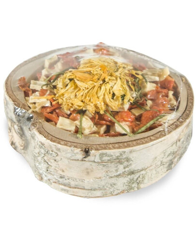 džiovinta beržo mediena, džiovinta morka, džiovinta pastarnokas, džiovintas petražolės stiebas, džiovintas medetkos žiedas, krakmolas.