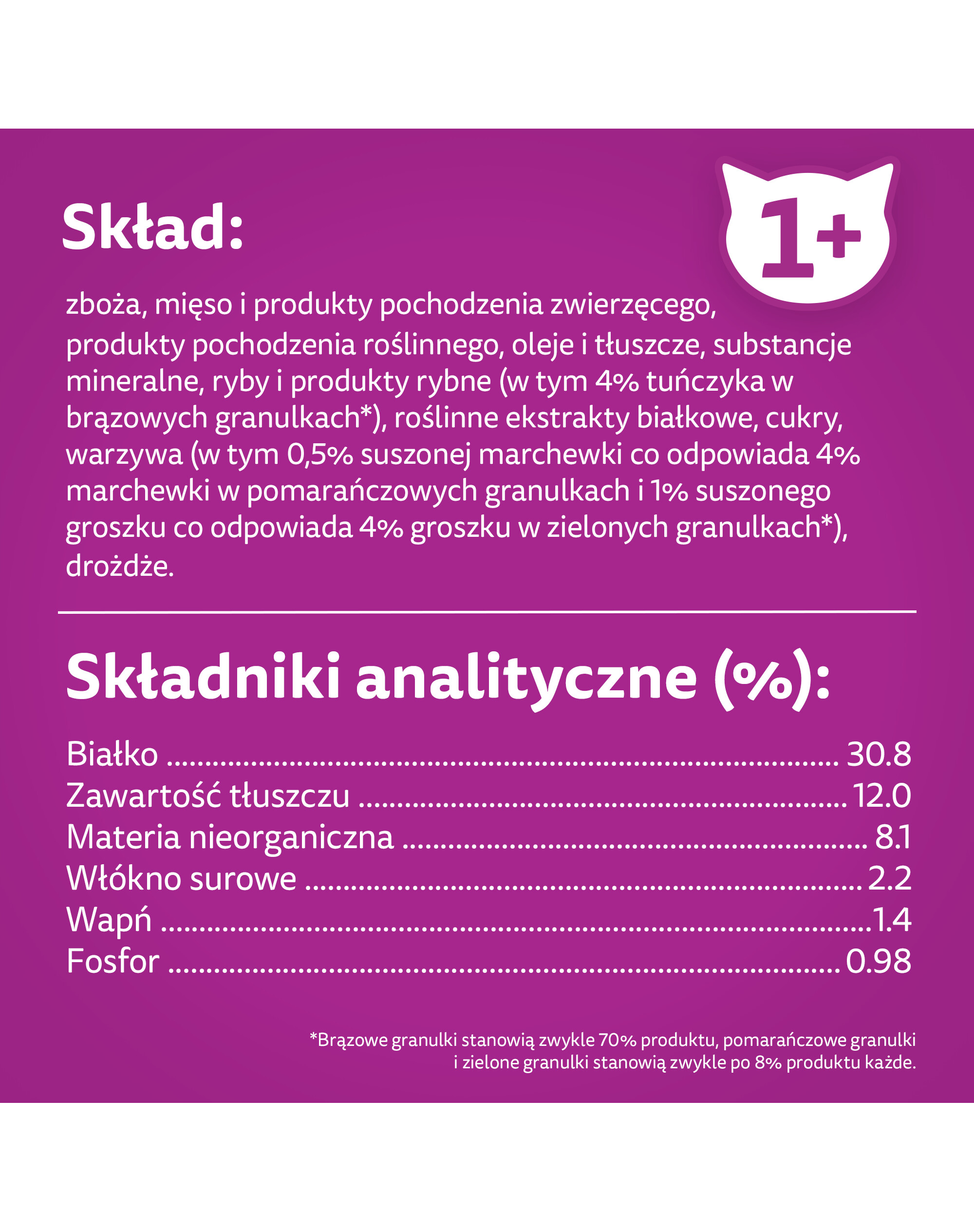 Sudėtis: Grūdai, mėsa ir gyvulinės kilmės produktai, augaliniai produktai, aliejai ir riebalai, mineralai, žuvis ir žuvies produktai (įskaitant 4 % tuno rudosiose granulėse*), augalinių baltymų ekstraktai, cukrus, daržovės (įskaitant 0,5 % džiovintų morkų, atitinkančių 4 % morkų oranžinėse granulėse, ir 1 % džiovintų žirnių, atitinkančių 4 % žirnių žaliosiose granulėse*), mielės.