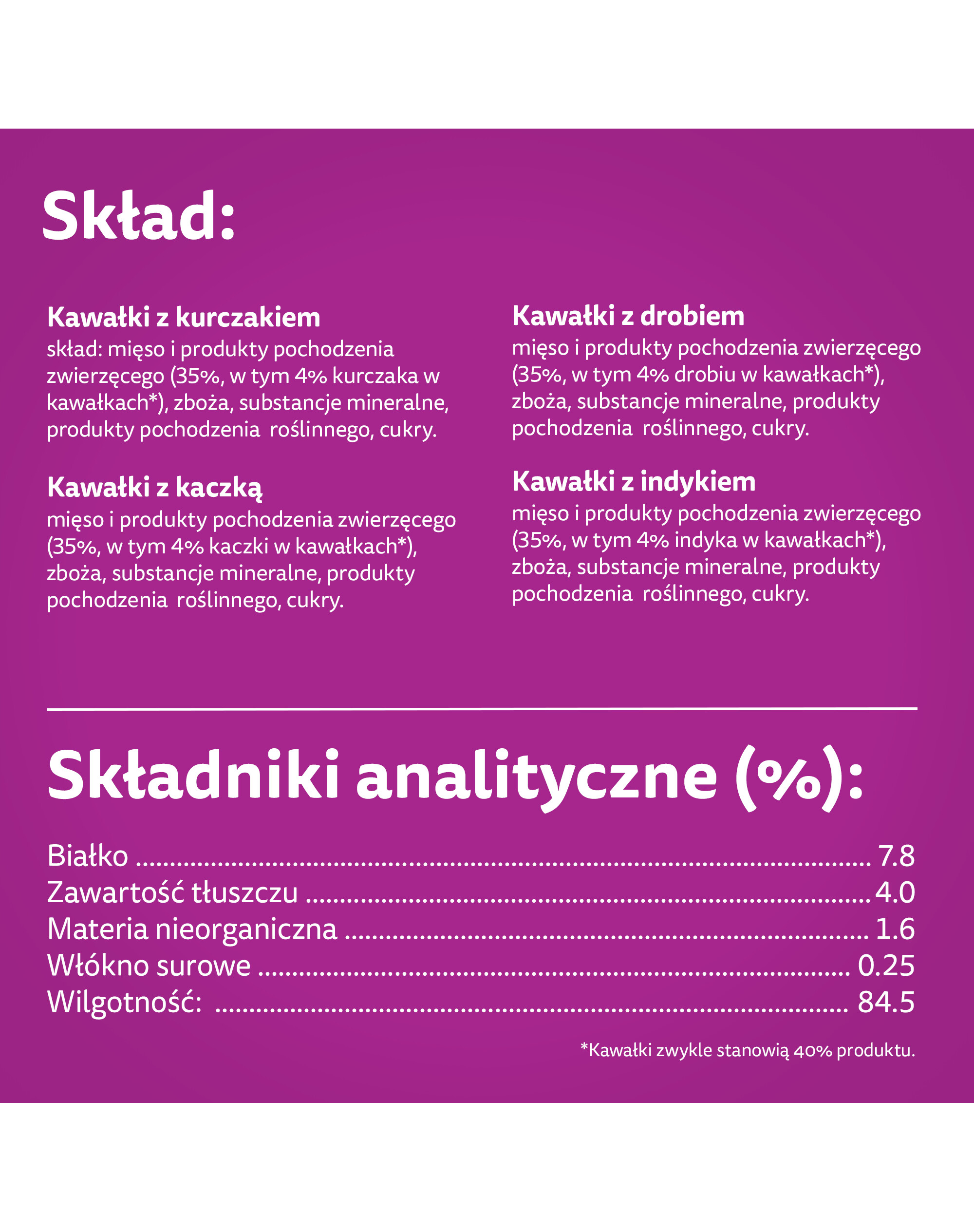 Sudėtis: mėsa ir gyvūninės kilmės produktai (25 %, 100 % natūralūs*; įskaitant 4 % vištienos gabalėlių**), augalinių baltymų ekstraktai, mineralai, cukrus, augalinės kilmės produktai. *Natūralios kilmės ingredientai. **Paprastai mėsos gabaliukai sudaro 40 % produkto.