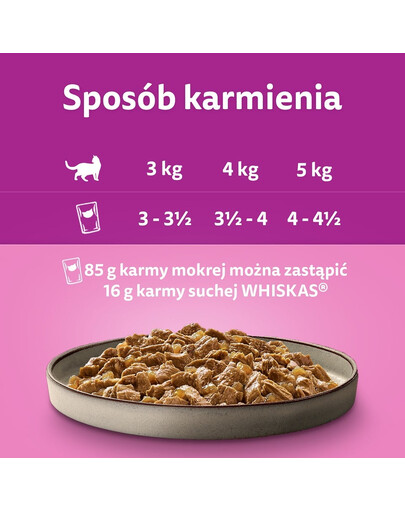 85 g drėgno maisto galima pakeisti 16 g WHISKAS sauso maisto.