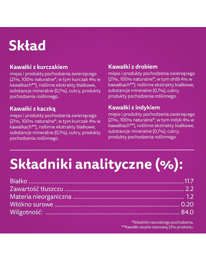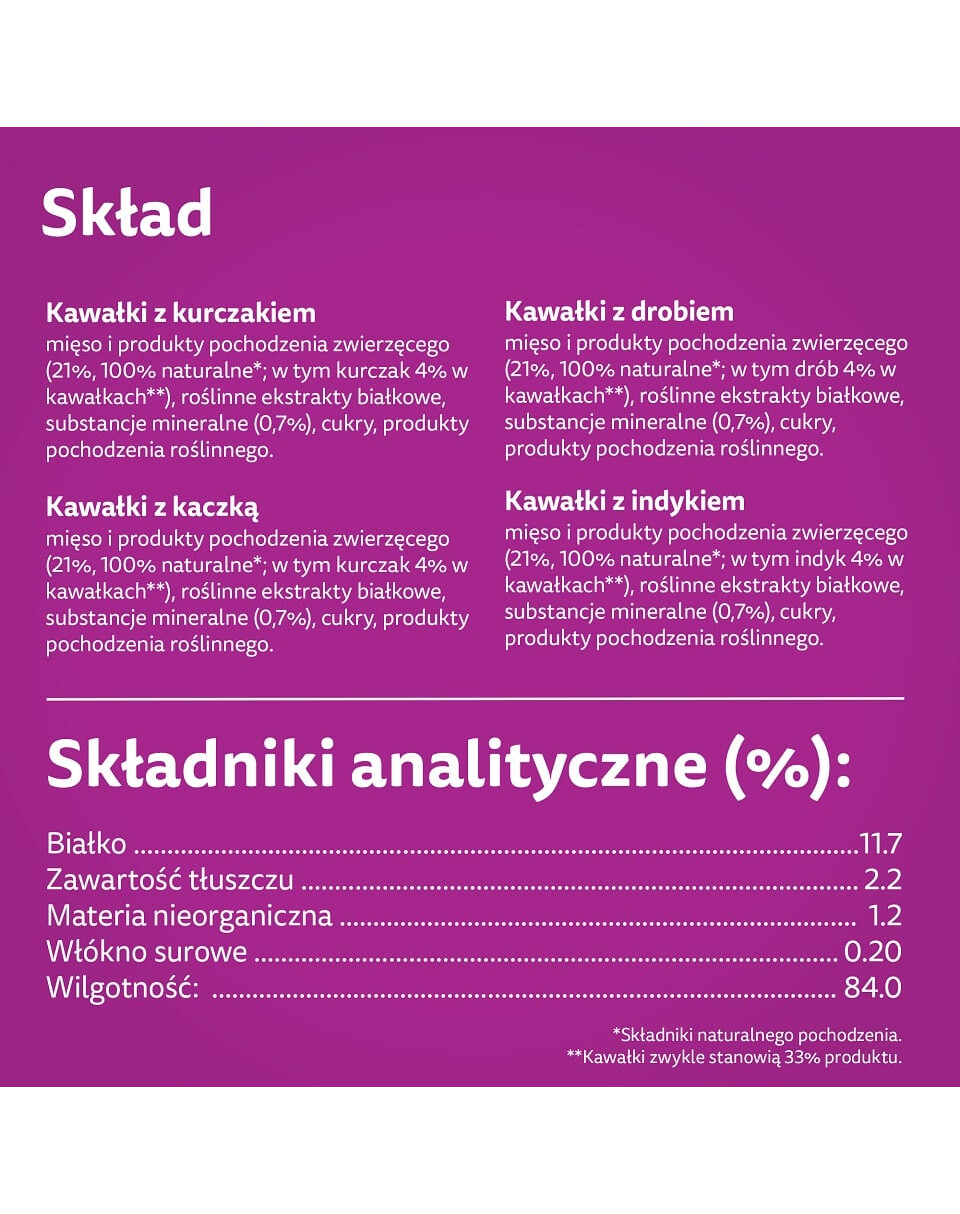 Gabalėliai su paukštiena - Sudėtis: mėsa ir gyvūninės kilmės produktai (21 %, 100 % natūralūs*; iš jų paukštiena 4 % gabalėliuose**), augalinių baltymų ekstraktai, mineralinės medžiagos (0,7 %), cukrus, augalinės kilmės produktai.*Natūralios kilmės sudedamosios dalys. **Kasetės paprastai sudaro 33 % produkto.
