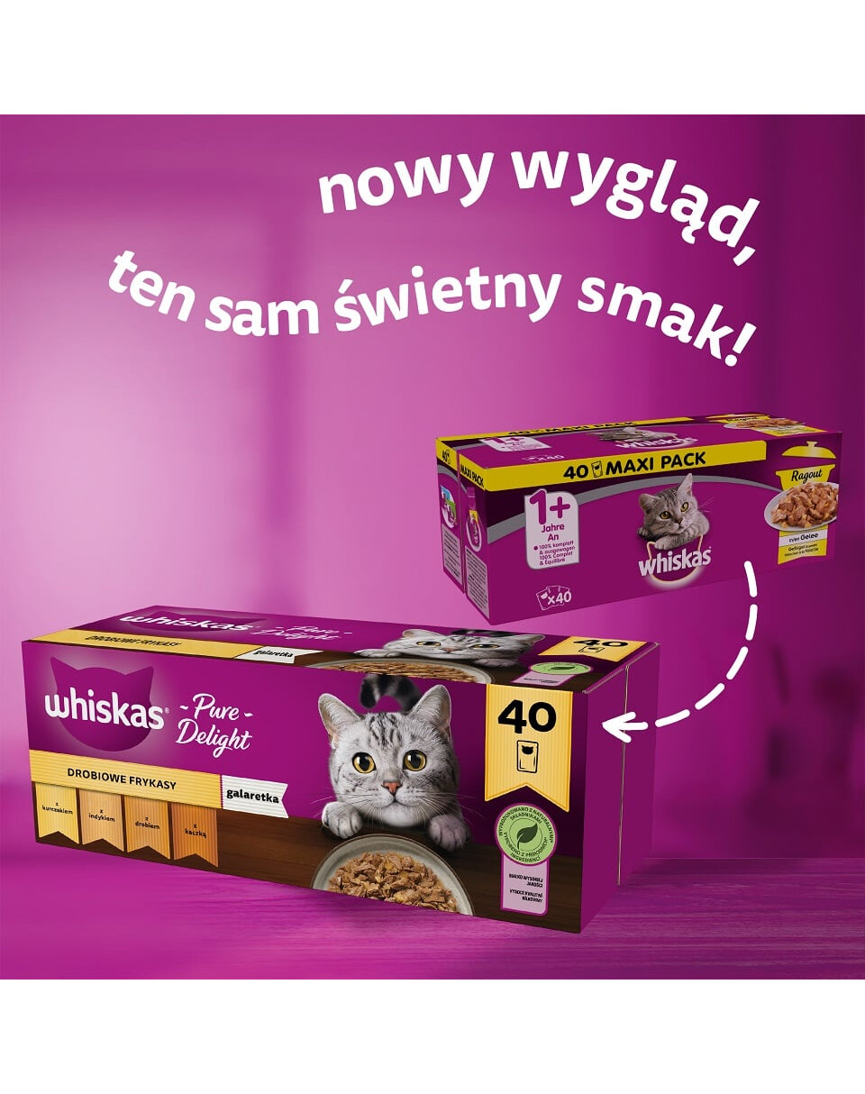 Skanūs "Whiskas Poultry Jellied Fries" maisto gabalėliai paruošti taip, kad išlaikytų natūralų skonį ir maistinę vertę. Paruošti garuose jie tampa sultingi ir švelnūs, todėl jūsų katė murks iš malonumo. Jūsų kačių draugas mėgausis vienu iš keturių variantų, gabalėliais su: vištiena, kalakutiena, paukštiena, antiena. Whiskas maistas ruošiamas iš natūralių ingredientų ir aukštos kokybės baltymų, nenaudojant dirbtinių dažiklių ar konservantų, kad būtų užtikrintas išskirtinis valgymo malonumas. Lengvai valgomuose skaniuose, švelniuose kąsniuose yra cinko, kuris palaiko odos ir kailio sveikatą, o tinkamas mineralų balansas padeda rūpintis jūsų augintinio šlapimo takais.