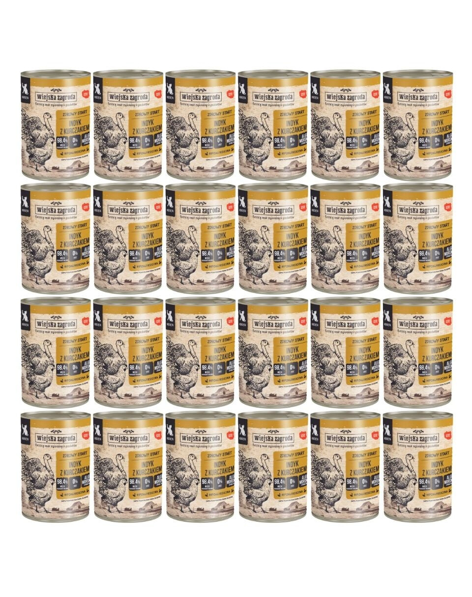 kalakutiena 35 % (iš jų apie 80 % raumenų ir širdies mėsos, apie 20 % kepenų), vištiena 35 % (100 % raumenų mėsos), kalakutienos ir vištienos sultinys 28,4 %, mineralai 1 %, lašišų aliejus 0,5 %, spirulina 0,1 %.