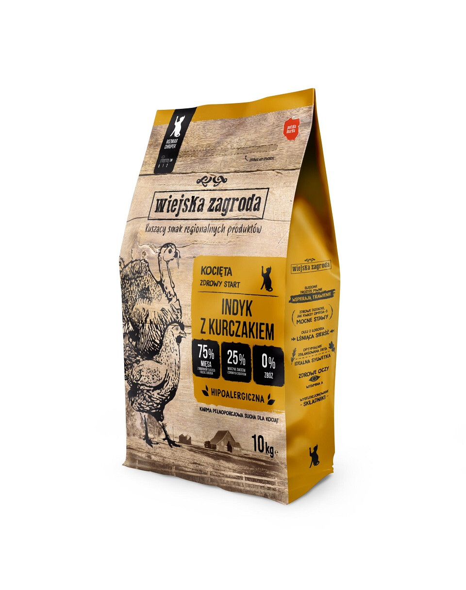 "Wiejska Zagroda" - tai lenkiškas visavertis maistas kačiukams, paruoštas itin kruopščiai. Vietinių tiekėjų regioniniai produktai - tai šviežumo ir kokybės garantija, kad ingredientai, iš kurių gaminame maistą, yra švieži ir kokybiški. Maistas buvo sukurtas iš poreikio duoti kačiukams tai, ko jiems labiausiai reikia - mėsos! Tai mėsa, kuri sudaro mažiausiai. 65,5 % kiekvieno maisto produkto.