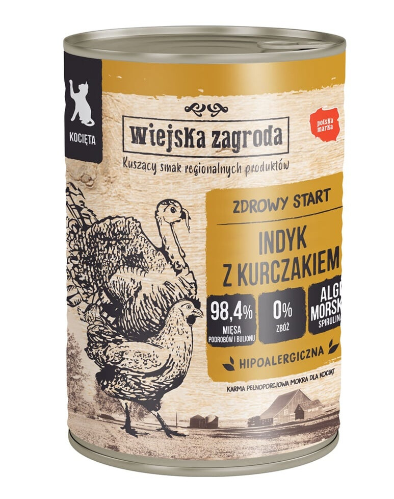 kalakutiena 35 % (iš jų apie 80 % raumenų ir širdies mėsos, apie 20 % kepenų), vištiena 35 % (100 % raumenų mėsos), kalakutienos ir vištienos sultinys 28,4 %, mineralai 1 %, lašišų aliejus 0,5 %, spirulina 0,1 %.