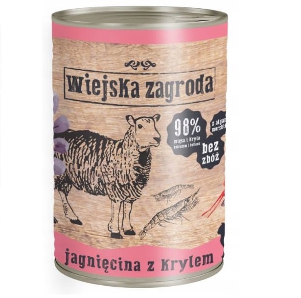 ėriena 66 % (iš jų apie 64 % raumenų ir širdies mėsos, apie 22,5 % plaučių, apie 13,5 % kepenų), ėrienos ir krilių sultinys 28,8 %, Antarktidos krilis 4 % (džiovintas 0,33 %), mineralai 1 %, lašišų aliejus 0,1 %, jūros dumbliai (spirulina) 0,1 %.