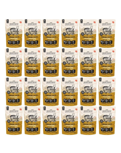 Ieškote sveiko ir skanaus drėgno maisto katėms, kuris būtų švelnus ir aromatingas? Wiejska Zagroda Avinienė su antis ir katžole yra mėsos, subproduktų ir supermaisto derinys, kuris sužavės kiekvieną katės gurmaną. Pakuotėse yra net 98,4% mėsos, subproduktų ir sultinio, taip pat lašišų aliejus, spirulina, katžolė, alaus mielės ir prebiotikai MOS ir FOS, kurie papildomai palaiko jūsų katės sveikatą.