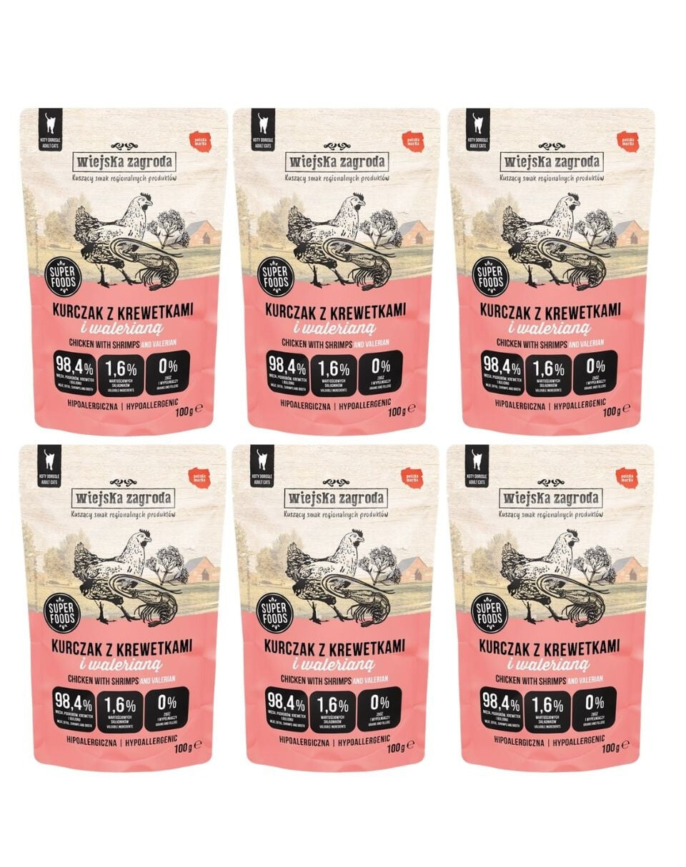 WIEJSKA ZAGRODA Superfoods Vištiena su krevetėmis ir valerijonais, šlapias kačių maistas, 6 x 100 g