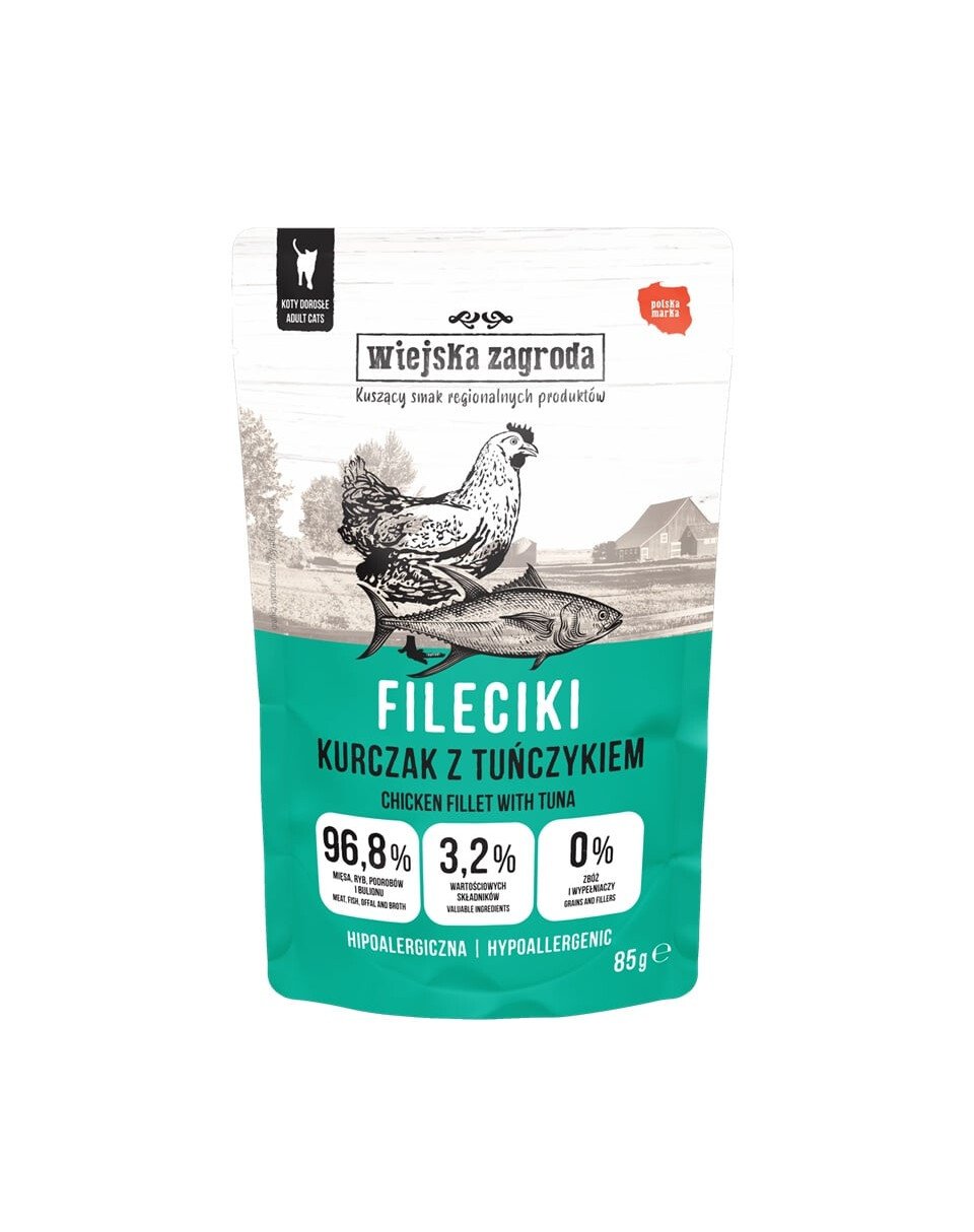Ieškote natūralaus drėgno maisto katėms, kuris būtų švelnių, sultingų filetų pavidalu, panardintų į aromatingą padažą? Filetai Wiejska Zagroda yra puikus pasirinkimas! Kiekviena pakuotė turi kruopščiai atrinktus vištienos ir tuno gabalėlius, kurie užtikrina puikų skonį ir maistinę vertę. Dėl net 96,8% mėsos, žuvies, vidaus organų ir sultinio, begrūdės formulės ir hipoalerginės sudėties, filetai tinka net katėms su jautria virškinimo sistema.
