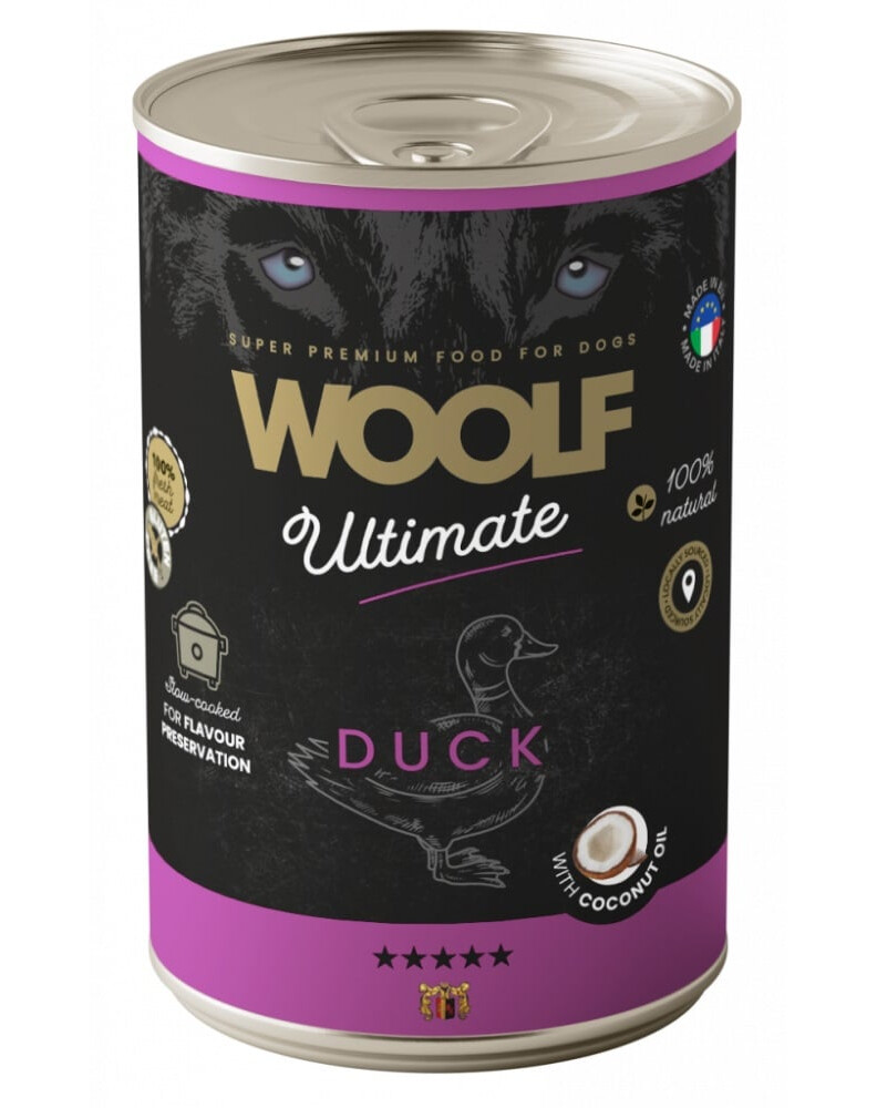 WOOLF Ultimate Adult Dog Duck and Coconut oil 400g drėgnas ėdalas šunims su antiena ir kokosų aliejumi