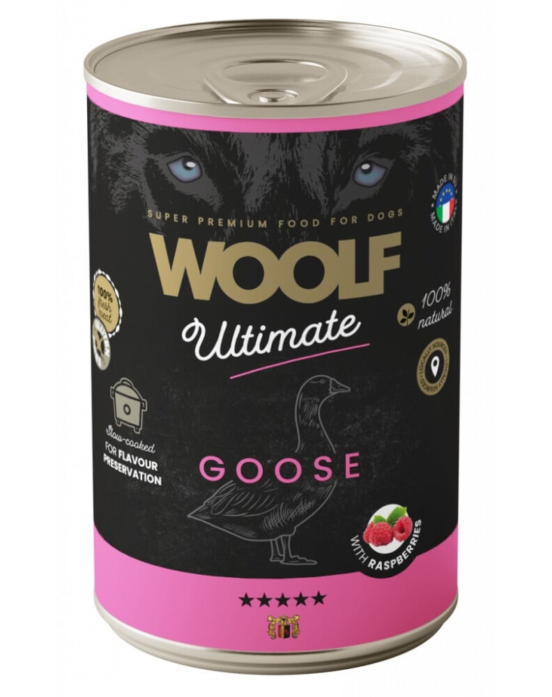 WOOLF Ultimate Adult Dog Goose and Raspberries yra visavertis, begluteniškas drėgnas maistas, sukurtas suaugusiems šunims visų veislių. Jo receptūra pagrįsta švelnia žąsiena – retai naudojamu baltymų šaltiniu, kuris tinka šunims su jautria virškinimo sistema ir linkusiems į alergijas. Aviečių priedas suteikia maistui malonų saldumą ir praturtina jį vitaminais, natūraliais antioksidantais bei ingredientais, kurie palaiko imunitetą ir turi priešuždegiminių savybių. Visi ingredientai gaunami iš vietinių tiekėjų ir yra apdorojami lėtai virinant žemoje temperatūroje, kas leidžia išsaugoti jų natūralią maistinę vertę ir išskirtinį skonį.