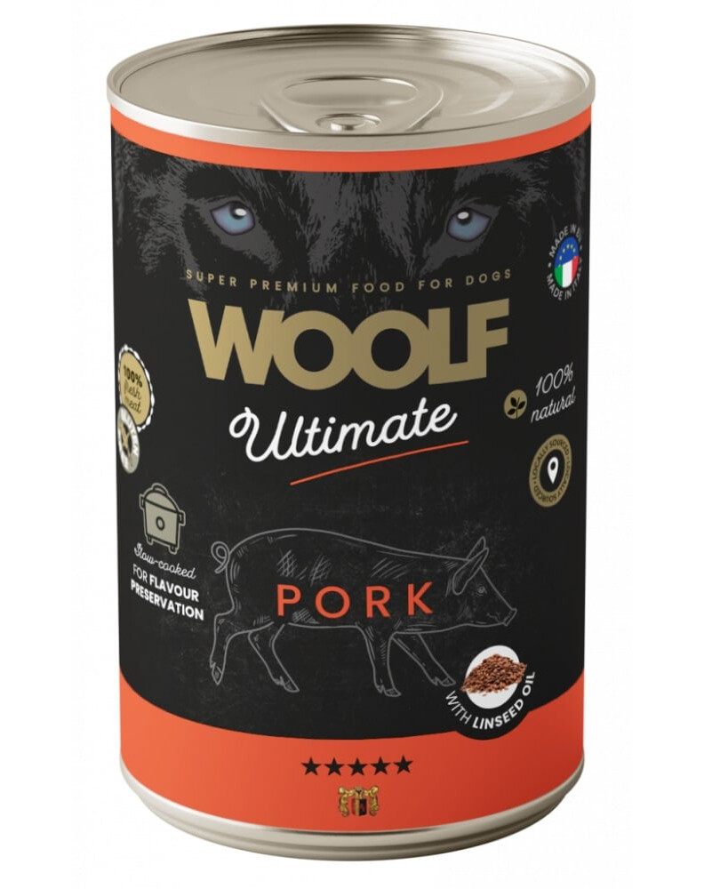 WOOLF Ultimate Adult Dog Pork and Linseed Oil yra visavertis, begluteniškas drėgnas maistas, sukurtas suaugusiems šunims visų veislių. Jo receptūra pagrįsta kiaulienos mėsa, kuri suteikia aukštos maistinės vertės baltymų, taip pat vidaus organais – plaučiais ir kepenimis – praturtinančiais aminorūgščių profilį. Linų sėmenų aliejaus pridėjimas yra omega-3 riebalų rūgščių šaltinis, palaikantis odos sveikatą, blizgantį kailį ir tinkamus virškinimo procesus. Visi ingredientai gaunami iš vietinių tiekėjų ir yra apdorojami lėtai virinant žemoje temperatūroje, kas leidžia išsaugoti jų natūralias maistines vertes ir išskirtinį skanėstą.