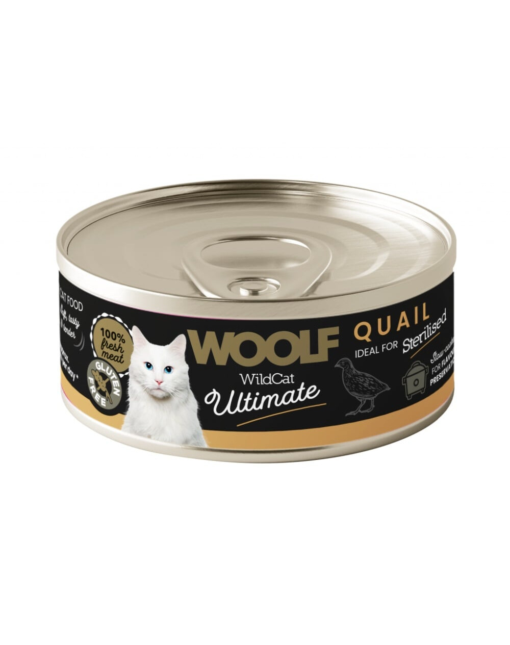 WOOLF Ultimate Cat Adult Sterilised Quail yra pilnavertis, be glitimo drėgnas maistas, pagamintas kaip švelnus paštetas, sukurtas suaugusioms katėms po sterilizacijos ar kastracijos. Pagrindinė sudedamoji dalis yra stručio mėsa – sultinga, lengvai virškinama ir turtinga būtinų maistinių medžiagų, palaikančių tinkamą organizmo funkcionavimą ir optimalaus kūno svorio išlaikymą.